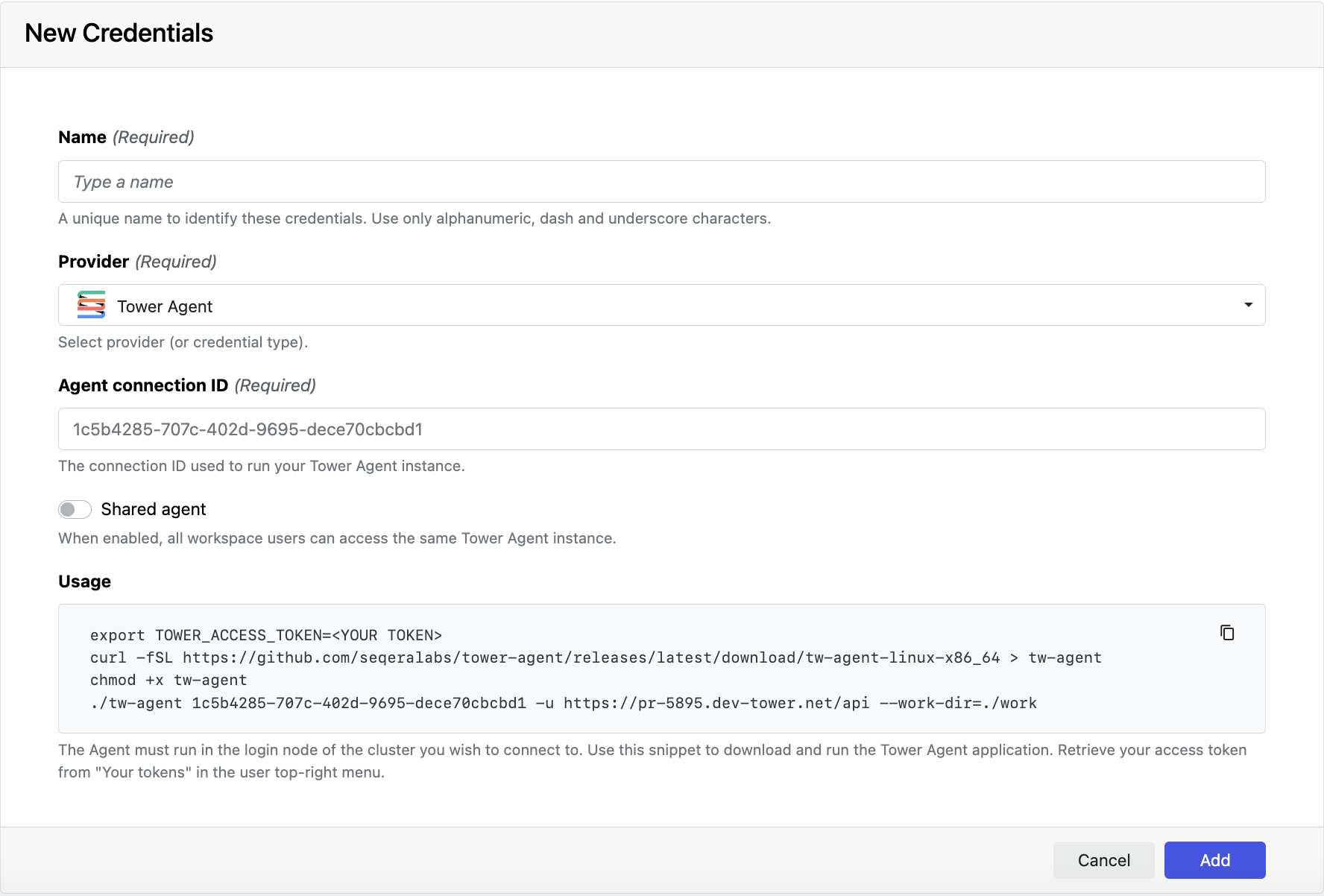 | Usage | Populates a code snippet for Tower Agent download with your connection ID. Replace <YOUR TOKEN> with your Seqera access token. |
